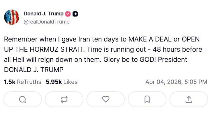 «Θυμάστε που έδωσα στο Ιράν δέκα ημέρες για να ΚΑΝΕΙ ΣΥΜΦΩΝΙΑ ή να ΑΝΟΙΞΕΙ ΤΑ ΣΤΕΝΑ ΤΟΥ ΟΡΜΟΥΖ; Ο χρόνος τελειώνει - απομένουν 48 ώρες πριν ξεσπάσει η απόλυτη κόλαση πάνω τους. Δόξα τω Θεώ! Πρόεδρος ΝΤΟΝΑΛΝΤ ΤΖ. ΤΡΑΜΠ» έγραψε ο Αμερικανός πρόεδρος.