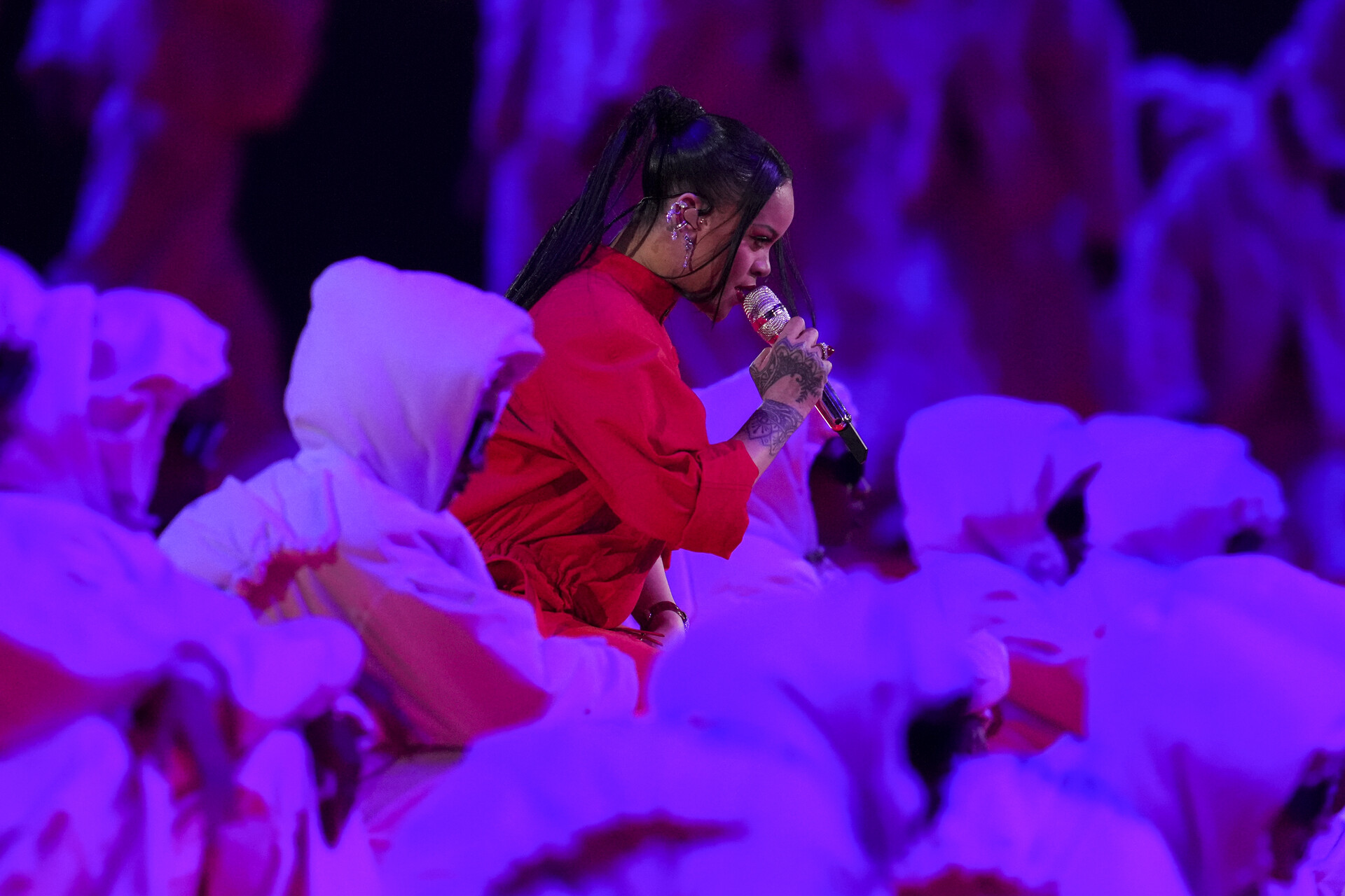 Η Rihanna εμφανίστηκε με ολόσωμη κόκκινη φόρμα, αποκάλυψε την φουσκωμένη κοιλιά της επιβεβαιώνοντας τις φήμες για δεύτερη εγκυμοσύνη και είπε όλες τις μεγάλες επιτυχίες της: Where Have You Been, We Found Love, Umbrella και Diamonds.