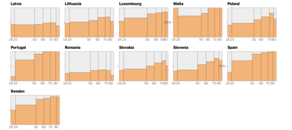 Στην Ιταλία, οι αρχές ζητούν από τους πολιτικούς ηγέτες να υποστηρίξουν τον εμβολιασμό, αλλά κάποιοι το αποφεύγουν. Ο Ματέο Σαλβίνι, ηγέτης της δεξιάς Λίγκας, παραμένει ανεμβολίαστος. Η ΕΕ αντιμετωπίζει πολύ μεγαλύτερες ανισότητες γεωγραφικά από τις ΗΠΑ. Η πλουσιότερη Δύση, όπου σε πολλές χώρες πάνω από το 80% έχει κάνει τουλάχιστον μία δόση, προηγείται κατά πολύ της ανατολής. Μόλις το 19% των ενηλίκων στη Βουλγαρία και το 32% στη Ρουμανία έχουν εμβολιαστεί μερικώς. Είναι τα φτωχότερα μέλη της ΕΕ.