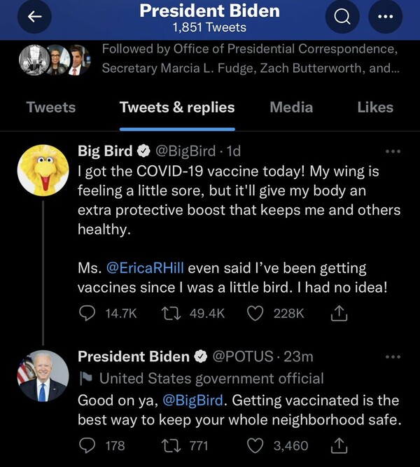 «Μπράβο, @BigBird», έγραψε ο Μπάιντεν στο Twitter το βράδυ της Κυριακής. «Το εμβόλιο είναι ο καλύτερος τρόπος για να κρατήσετε ολόκληρη τη γειτονιά σας ασφαλή».