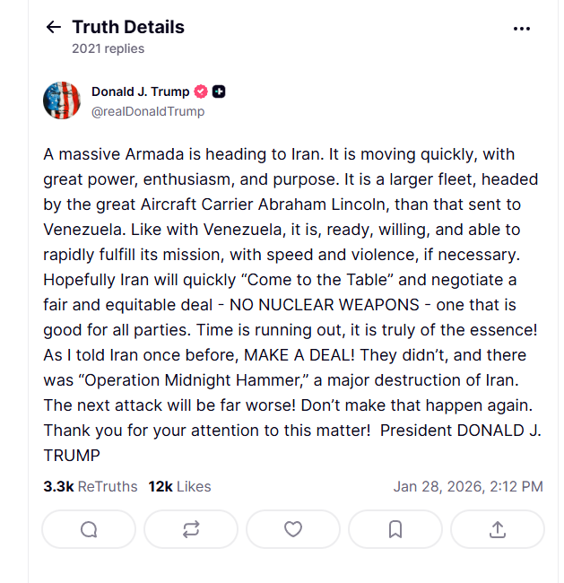 Σε ανάρτησή του στα μέσα κοινωνικής δικτύωσης, ο Αμερικανός πρόεδρος έγραψε ότι ο στόλος, με επικεφαλής το αεροπλανοφόρο USS Abraham Lincoln, είναι μεγαλύτερος από εκείνον που είχε σταλεί στη Βενεζουέλα πριν από την απομάκρυνση του προέδρου Νικολάς Μαδούρο νωρίτερα μέσα στον μήνα. Πρόσθεσε ότι είναι «έτοιμος να εκπληρώσει γρήγορα τις αποστολές του με ταχύτητα και βία, αν χρειαστεί» και ότι κινείται προς το Ιράν «με μεγάλη ισχύ, ενθουσιασμό και σκοπό».