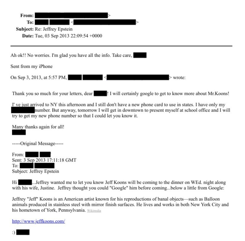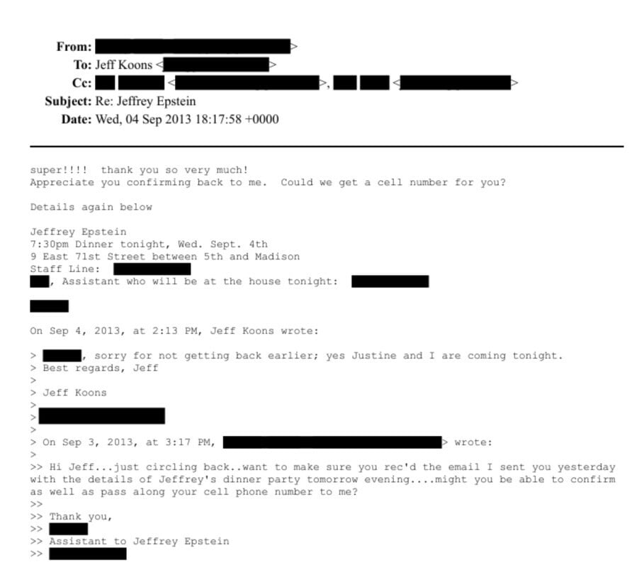 «Ο Τζέφρι μου ζήτησε να σας ενημερώσω ότι ο Jeff Koons θα παρευρεθεί στο δείπνο την Τετάρτη το βράδυ μαζί με τη σύζυγό του, Τζαστίν. Ο Τζέφρι σκέφτηκε ότι θα μπορούσατε να τον "γκουγκλάρετε" πριν έρθετε», ανέφερε το μήνυμα.