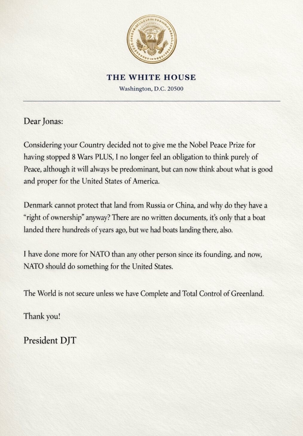 «Αγαπητέ Γιόνας. Λαμβάνοντας υπόψη ότι η χώρα σου αποφάσισε να μην μου δώσει το Νόμπελ Ειρήνης, επειδή σταμάτησα οκτώ πολέμους και βάλε, δεν αισθάνομαι πλέον υποχρέωση να σκέφτομαι καθαρά με γνώμονα την ειρήνη, παρότι αυτή θα παραμένει κυρίαρχη, αλλά μπορώ πλέον να σκέφτομαι τι είναι καλό και προσήκον για τις Ηνωμένες Πολιτείες της Αμερικής. Η Δανία δεν μπορεί να προστατεύσει αυτή τη γη από τη Ρωσία ή την Κίνα, και γιατί έχουν «δικαίωμα κυριότητας» έτσι κι αλλιώς; Δεν υπάρχουν γραπτά έγγραφα, είναι απλώς ότι ένα πλοίο αποβιβάστηκε εκεί πριν από εκατοντάδες χρόνια, αλλά και εμείς είχαμε πλοία που αποβιβάστηκαν εκεί. Έχω κάνει περισσότερα για το ΝΑΤΟ από οποιονδήποτε άλλον από την ίδρυσή του και τώρα το ΝΑΤΟ πρέπει να κάνει κάτι για τις Ηνωμένες Πολιτείες. Ο κόσμος δεν είναι ασφαλής αν δεν έχουμε πλήρη και απόλυτο έλεγχο της Γροιλανδίας. Ευχαριστώ. Πρόεδρος DJT».
