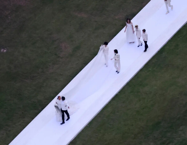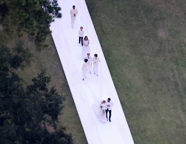 Η τελετή έγινε σε εξωτερικό χώρο με λευκές καρέκλες για τους καλεσμένους που περιβάλλονται από πράσινο και λευκά λουλούδια, ένα ολόλευκο πιάνο, κομψά τραπέζια στημένα σε μια αποβάθρα δίπλα στο ποτάμι και μια πλατφόρμα για πυροτεχνήματα.