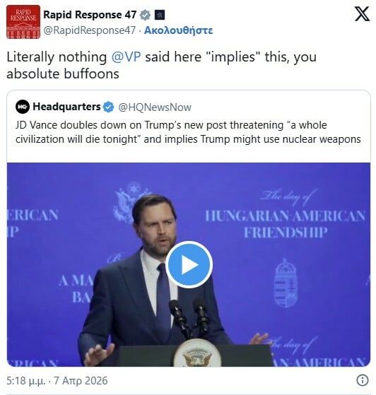 Ακολούθησε μια ανάρτηση στα social media, από λογαριασμό ο οποίος σχετίζεται με την πρώην υποψήφια των Δημοκρατικών για την προεδρία Κάμαλα Χάρις. Η ανάρτηση έγραφε: «Ο Τζέι Ντι Βανς συνεχίζει και επιτείνει την απειλή του Τραμπ ότι “ένας ολόκληρος πολιτισμός θα πεθάνει απόψε”, και υπονοεί ότι ο Τραμπ μπορεί να χρησιμοποιήσει πυρηνικά όπλα».