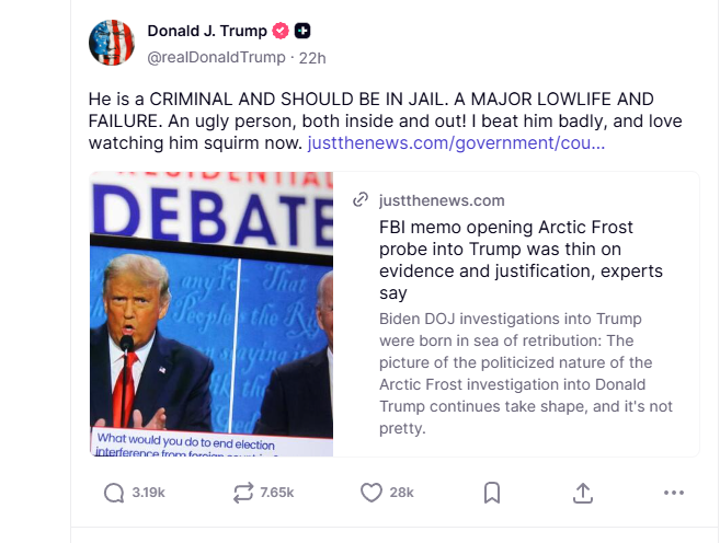 Η ανάρτηση του Αμερικανού προέδρου ήρθε μετά τη δημοσίευση ενός ρεπορτάζ του Just The News, σύμφωνα με το οποίο ένα εσωτερικό υπόμνημα του FBI που αποτέλεσε τη βάση της έρευνας για τα γεγονότα της 6ης Ιανουαρίου, φέρεται να «είχε ελλιπή αποδεικτικά στοιχεία και νομική τεκμηρίωση».