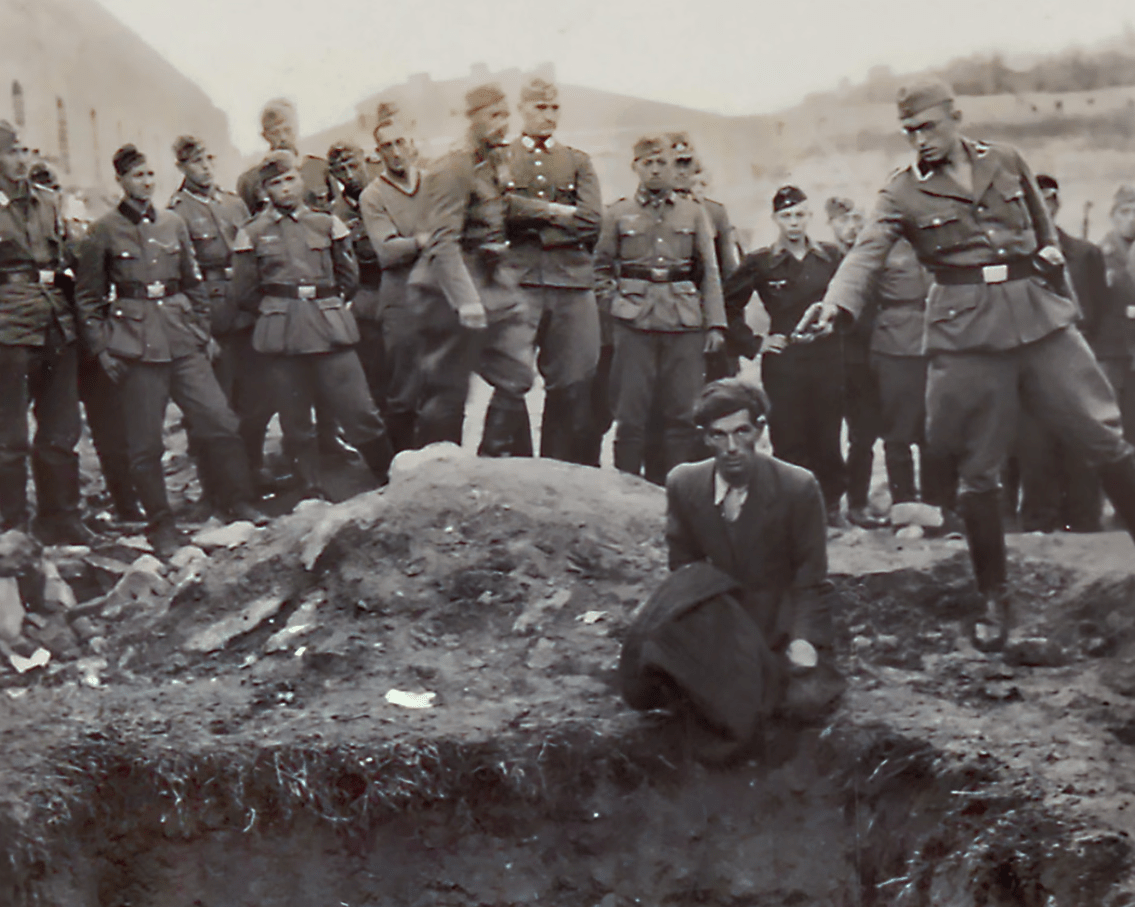 Μία από τις πιο ανατριχιαστικές φωτογραφίες του Ολοκαυτώματος δείχνει έναν ναζί στρατιώτη με γυαλιά να στοχεύει με πιστόλι το κεφάλι ενός άνδρα που γονατίζει, ενώ μπροστά του υπάρχει ένα λάκκο γεμάτο πτώματα. Γερμανοί στρατιώτες περιβάλλουν τη σκηνή.