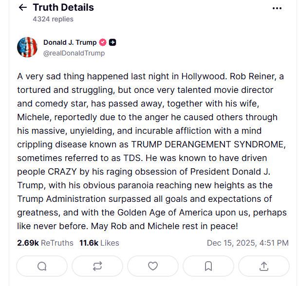 Στο μήνυμά του, ο Τραμπ αναφέρεται στον Reiner με απαξιωτικούς και ειρωνικούς χαρακτηρισμούς, αποδίδοντας –χωρίς καμία τεκμηρίωση– τον θάνατό του σε αυτό που αποκαλεί «Trump Derangement Syndrome», έναν όρο που χρησιμοποιεί συχνά για να περιγράψει σφοδρούς επικριτές του. Ο Αμερικανός πρόεδρος κάνει λόγο για «εμμονή» του σκηνοθέτη με το πρόσωπό του και για «παράνοια», την οποία συνδέει με τις πολιτικές εξελίξεις στις ΗΠΑ.