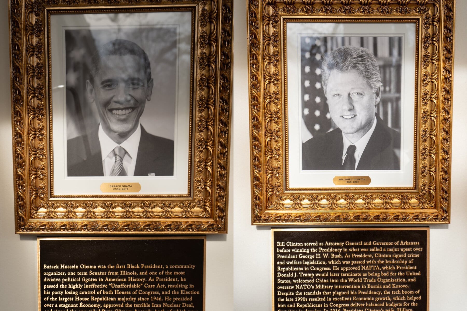 Η περιγραφή του πρώην προέδρου Τζο Μπάιντεν, ο οποίος εκπροσωπείται με φωτογραφία ενός autopen, εμπεριέχει γνωστά παράπονα του Τραμπ. «Ο Sleepy Joe Biden ήταν, μακράν, ο χειρότερος Πρόεδρος στην αμερικανική Ιστορία. Ανέλαβε καθήκοντα ως αποτέλεσμα της πιο διεφθαρμένης Εκλογής που έχει δει ποτέ η χώρα και επέβλεψε μια σειρά άνευ προηγουμένου καταστροφών που έφεραν το Έθνος μας στο χείλος της καταστροφής», αναφέρει μέρος της πλάκας. «Αλλά παρ' όλα αυτά, ο Πρόεδρος Τραμπ θα επανεκλεγόταν με συντριπτική νίκη και θα ΕΣΩΖΕ ΤΗΝ ΑΜΕΡΙΚΗ!»