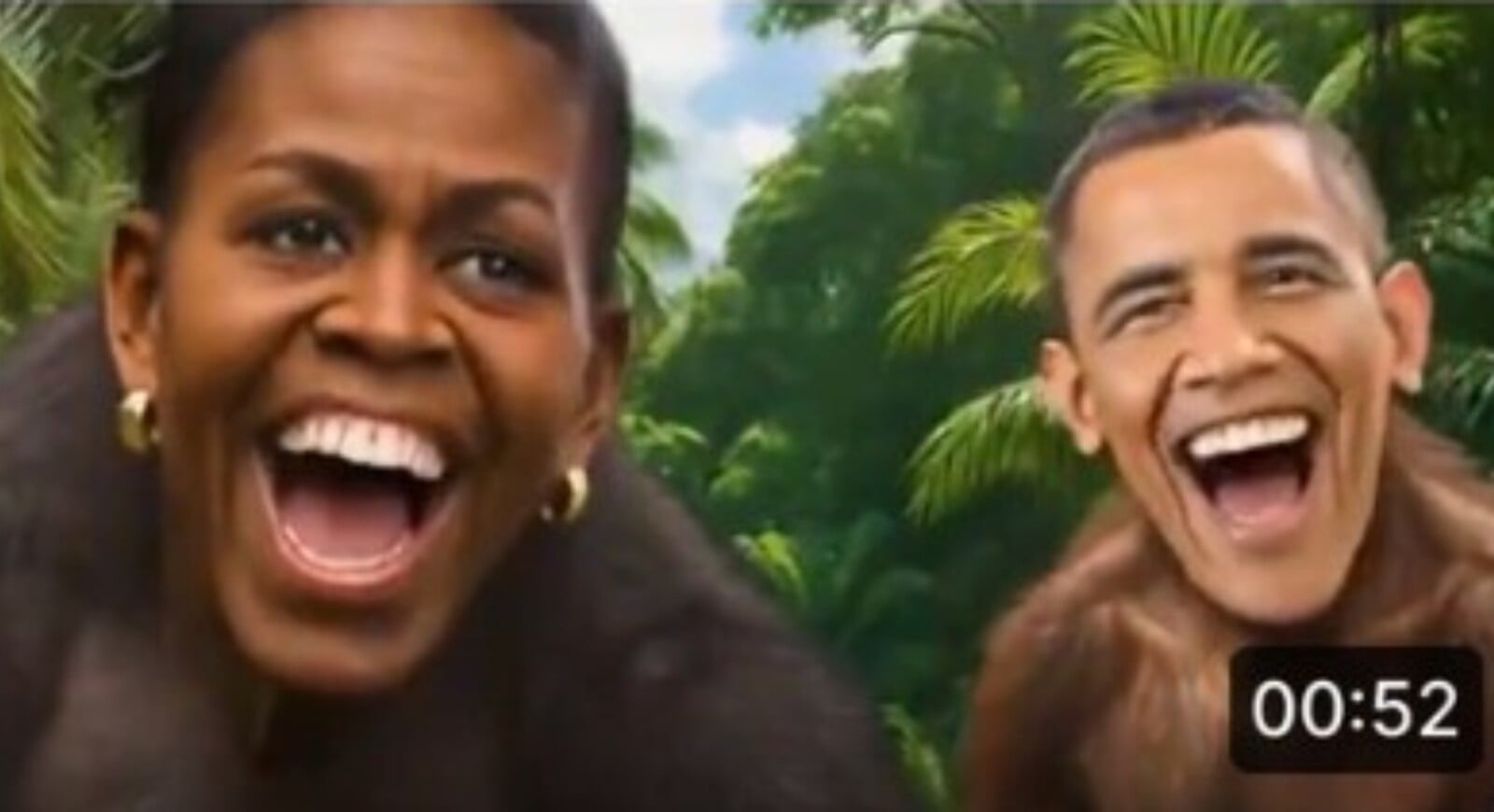 Λίγο πριν από το τέλος της ανάρτησης και για δύο δευτερόλεπτα εμφανίζεται στο βίντεο ένα στιγμιότυπο με το ζεύγος Ομπάμα, να χαμογελούν πάνω σε σώματα πιθήκων, με φόντο τη ζούγκλα.