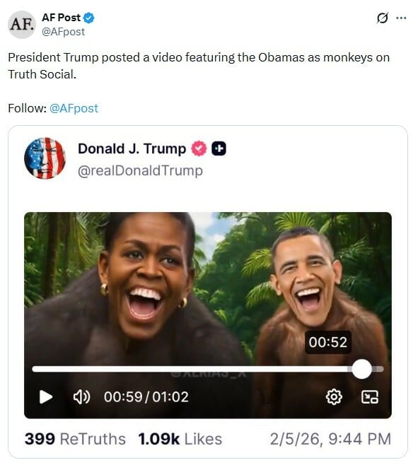 Κάποιοι σχολίασαν επίσης, πως η ανάρτηση αποτελεί μια φυλετική προσβολή για τον πρώτο Αφροαμερικανό πρόεδρο κατά τη διάρκεια του Μήνα Μαύρης Ιστορίας ο οποίος είναι ο Φεβρουάριος. «Ο Τραμπ δημοσίευσε μια φωτογραφία με τον Ομπάμα ως μαϊμού στο τέλος του βίντεο κατά τη διάρκεια του Μήνα Μαύρης Ιστορίας, τι στο καλό», έγραφε ένα σχόλιο στο X.