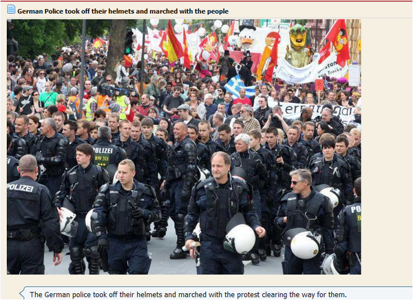 Η φωτογραφία αυτή κάνει το γύρο το διαδικτύου με τη λεζάντα «τα ΜΑΤ έβγαλαν τα κράνη και διαδήλωσαν με τον κόσμο στη Γερμανία». Η δυσπιστία σε τέτοιες περιπτώσεις-καθώς στο διαδίκτυο εύκολα διαδίδεται ως γεγονός μια ανεπιβεβαίωτη πληροφορία- και το παρελθόν ανάλογων θεμάτων που τελικά διαψεύστηκαν, μας οδήγησε να το ψάξουμε λίγο παραπάνω. Βρήκαμε το θέμα στο globalwinnipeg αλλά και σε άλλα Μέσα και η ιστορία της φωτογραφίας περιγράφεται ως εξής: «Περίπου 20.000 άνθρωποι διαδήλωσαν στη Φραγκφούρτη το Σάββατο 19 Μαΐου σε κινητοποίηση που διοργάνωσε το κίνημα Occupy, κατά των μέτρων λιτότητας σε πολλές χώρες της Ευρώπης, την κυριαρχία των τραπεζών και αυτό που αποκαλούν «αδάμαστο καπιταλισμό".
