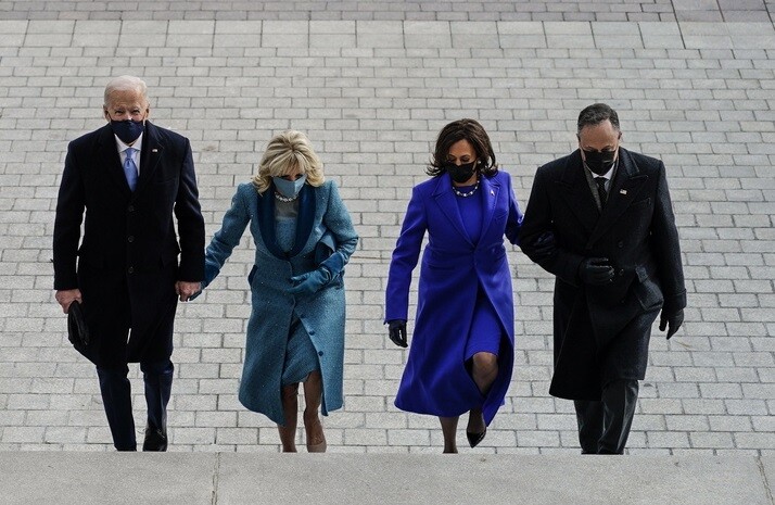 Ο Τζο Μπάιντεν και ο σύζυγος της Κάμαλα Χάρις, Νταγκ Έμχοφ, επέλεξαν τον σχεδιαστή Ralph Lauren για τα κοστούμια τους, με τον νέο Αμερικανό πρόεδρο να φορά ανοικτή μωβ γραβάτα.