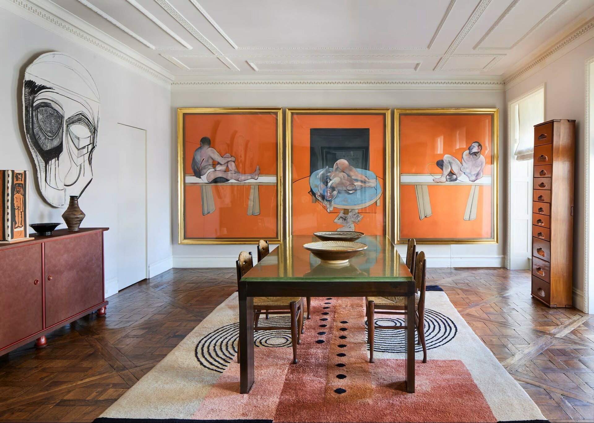 Στην τραπεζαρία του σπιτιού δεσπόζει το τρίπτυχο του Φράνσις Μπέικον «Studies of the Human Body», που δεν περιλαμβάνεται στη δημοπρασία. Αντίθετα, οι καρέκλες του Ρουλμάν, το τραπέζι του Ζακ Γκρανζ, το χαλί του Ιβάν ντα Σίλβα Μπρουνς από τη δεκαετία του 1920 και το βάθρο-ντουλάπι του Αλεξάντρ Νολ βγαίνουν στο σφυρί.