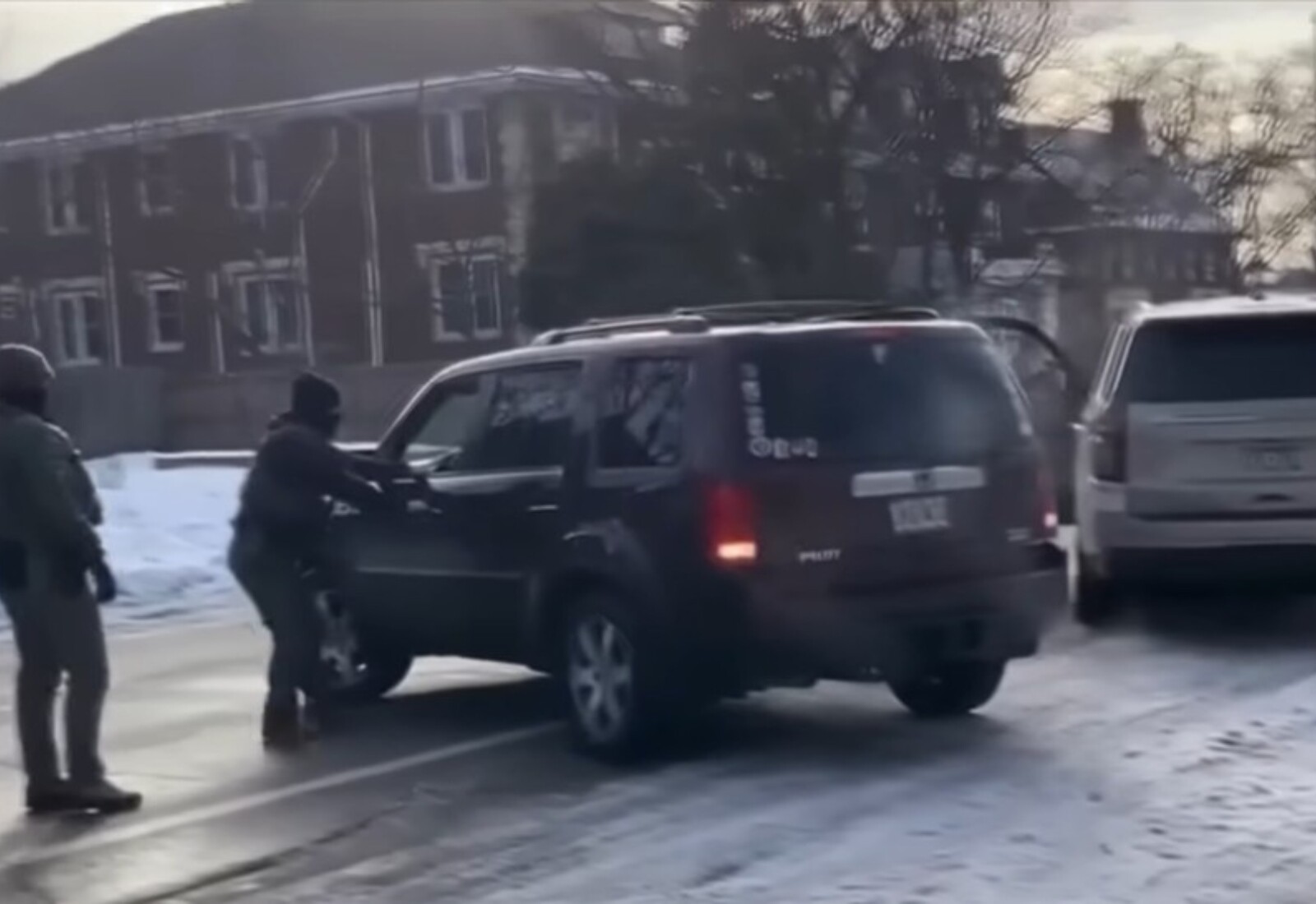 Σε βίντεο που κυκλοφορεί σε ιστότοπους κοινωνικής δικτύωσης, το οποίο το Γαλλικό Πρακτορείο λέει πως έχει επαληθεύσει, βλέπει κανείς αστυνομικούς να κατευθύνονται πως όχημα τύπου SUV, ένα Honda Pilot, σε χιονισμένο δρόμο.