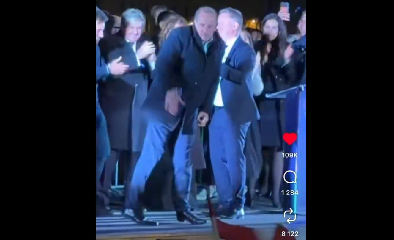 Στο στιγμιότυπο, που καταγράφηκε από δημοσιογράφο του RTL Νοέμι Ζαλαβάρι, εμφανίζεται να πανηγυρίζει ξέφρενα πάνω στη σκηνή, χορεύοντας και γιορτάζοντας τη μεγάλη εκλογική νίκη.