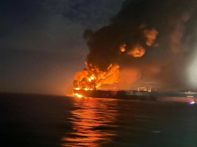 Σε βίντεο που μοιράστηκε ο αξιωματούχος φαίνονται ναυτικά drones να κινούνται με ταχύτητα προς τα τεράστια δεξαμενόπλοια, ακολουθούμενα από ισχυρές εκρήξεις που προκάλεσαν φωτιές στα πλοία.