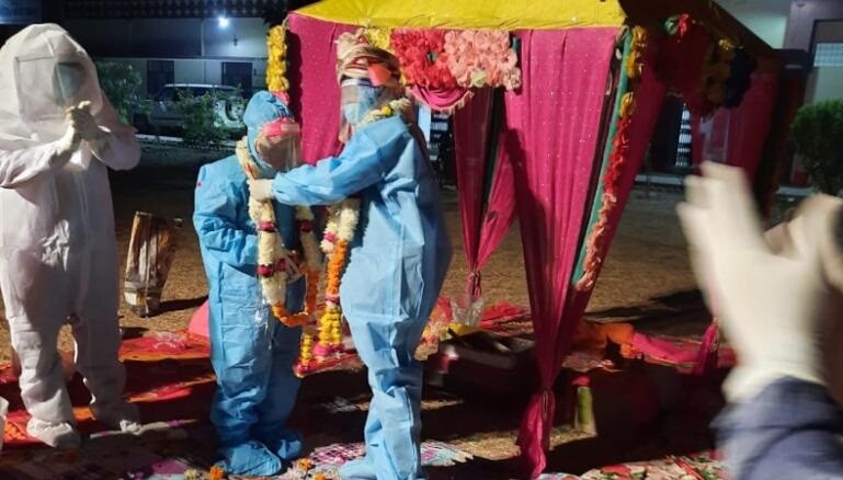 Η παραδοσιακή γαμήλια ενδυμασία αντικαταστάθηκε από στολές προστασίας και μάσκες, σε ένα απομακρυσμένο χωριό της Ινδίας, επειδή η νύφη διαγνώστηκε θετική στον κορωνοϊό λίγες ώρες πριν την τελετή.