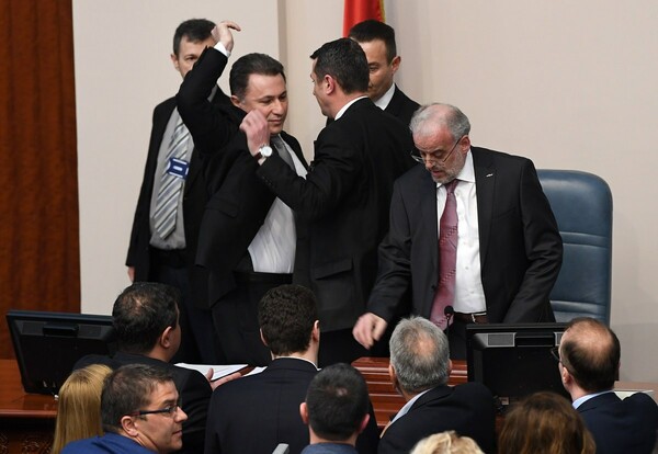 Η στιγμή που ο βουλευτής του VMRO-DPMNE και πρώην πρωθυπουργός Νίκολα Γκρούεφσκι επιτίθεται στον πρόεδρο της Βουλής Ταλάτ Τζαφέρι: