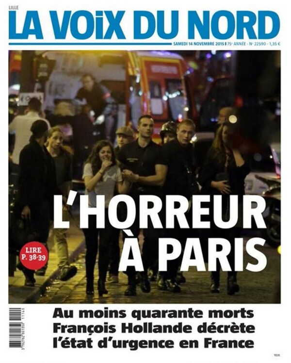 "Πόλεμος στο Παρίσι" γράφει σήμερα ο γαλλικός Τύπος και καλεί στην "σύσταση μετώπου" μετά τις τρομοκρατικές επιθέσεις που σημειώθηκαν ταυτοχρόνως χθες το βράδυ στη γαλλική πρωτεύουσα, προκαλώντας τον θάνατο 126 ανθρώπων και τον τραυματισμό περισσότερων από 200, εκ των οποίων οι 80 είναι σοβαρά.