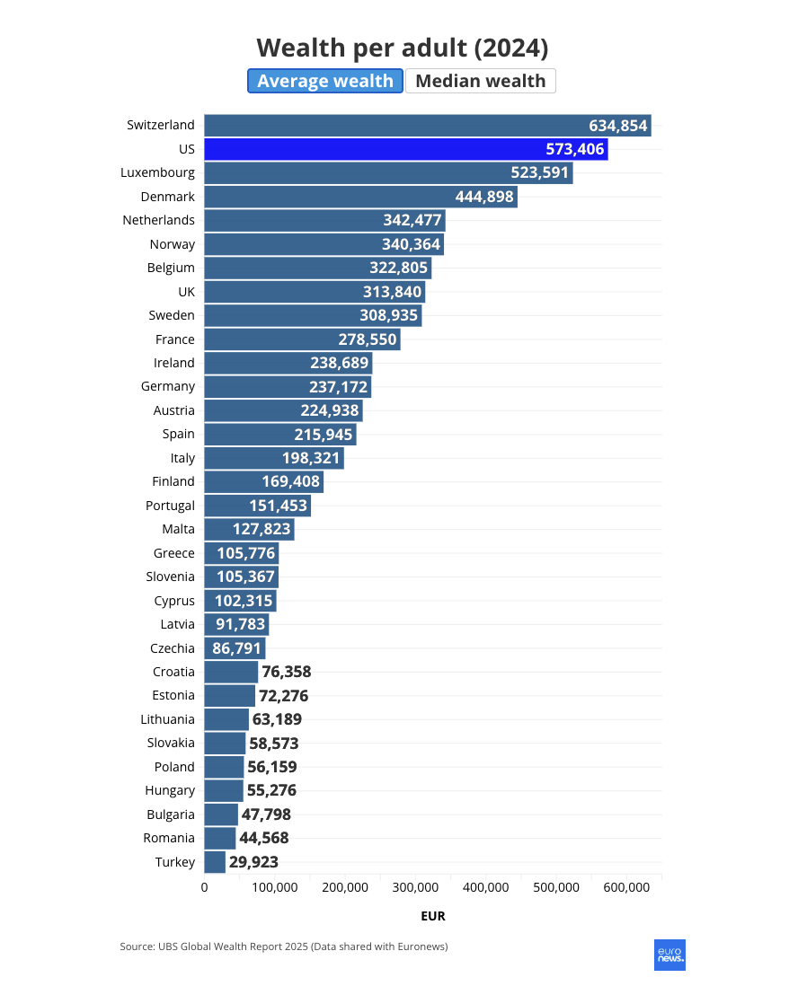 Οι διαφορές στον πλούτο των Ευρωπαίων παραμένουν σημαντικές και αποτυπώνονται στα τελευταία στοιχεία της UBS. Σύμφωνα με την έκθεση Global Wealth Report 2025, ο μέσος καθαρός πλούτος ανά ενήλικα το 2024 κυμαινόταν από 29.923 ευρώ στην Τουρκία έως 634.584 ευρώ στην Ελβετία, αναδεικνύοντας το έντονο χάσμα μεταξύ Δυτικής και Ανατολικής Ευρώπης.