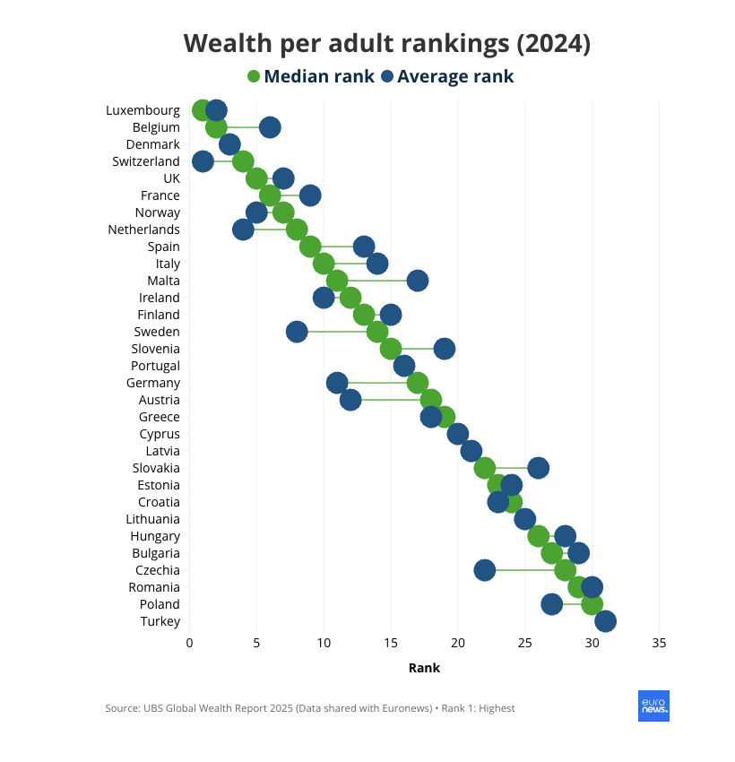 Η διάμεσος πλούτου ανά ενήλικα κυμαίνεται από 7.765 ευρώ στην Τουρκία έως 365.244 ευρώ στο Λουξεμβούργο. Εντός της ΕΕ, το χαμηλότερο επίπεδο καταγράφεται στην Πολωνία με 22.257 ευρώ.