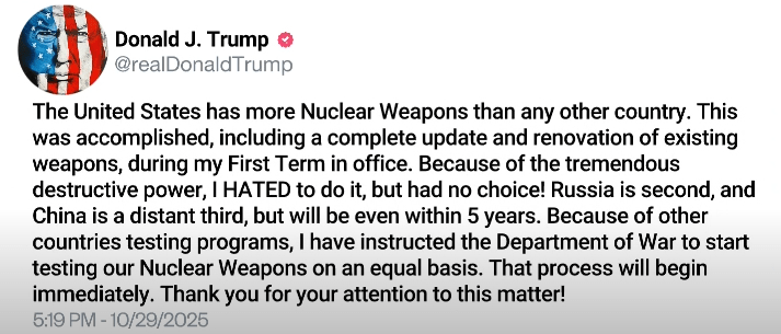 Η εντολή Τραμπ, που δόθηκε την προηγούμενη εβδομάδα, προέβλεπε την άμεση έναρξη δοκιμών «σε ίσους όρους» με άλλες χώρες. Οι Ηνωμένες Πολιτείες δεν έχουν πραγματοποιήσει πυρηνική δοκιμή από το 1992, ενώ η Κίνα και η Γαλλία σταμάτησαν το 1996 και η Σοβιετική Ένωση το 1990.