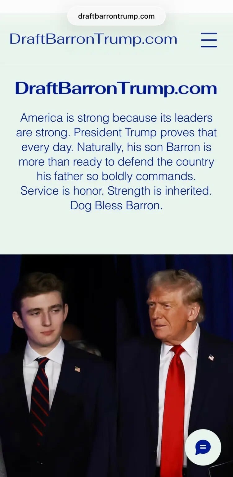 Ο Toby Morton, 50 ετών, παρουσίασε την ιστοσελίδα με τίτλο «DraftBarronTrump.com», η οποία εμφανίζεται ως παρωδία πολιτικής ρητορικής υπέρ της στρατιωτικής ισχύος. Στο κεντρικό της μήνυμα, το site υποστηρίζει ειρωνικά ότι «ηγεσία σημαίνει δύναμη» και ότι ο νεότερος γιος του προέδρου θα έπρεπε να υπηρετήσει τη χώρα στο εξωτερικό. Η σελίδα περιλαμβάνει φωτογραφίες του 19χρονου Barron Trump, καθώς και σατιρικά “testimonials” που αποδίδονται σε μέλη της οικογένειας Trump.