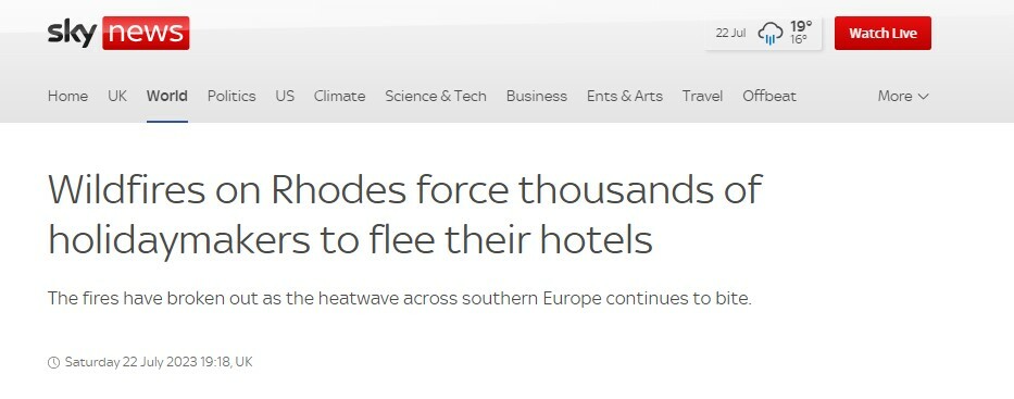 Το βρετανικό δίκτυο BBC έχει επίσης πρώτη είδηση τη φωτιά στη Ρόδο αναφέροντας ότι «χιλιάδες εγκαταλείπουν σπίτια και ξενοδοχεία στη Ρόδο καθώς οι πυρκαγιές εξαπλώνονται».