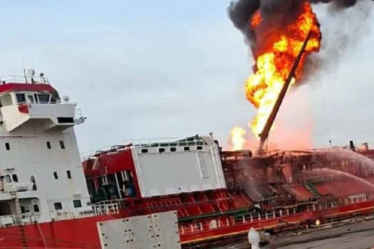 Βίντεο που κυκλοφόρησαν στα κοινωνικά δίκτυα δείχνουν τεράστιες φλόγες και πυκνό καπνό να υψώνονται από το δεξαμενόπλοιο, ενισχύοντας τις ανησυχίες για την επικινδυνότητα του φορτίου υγραερίου.