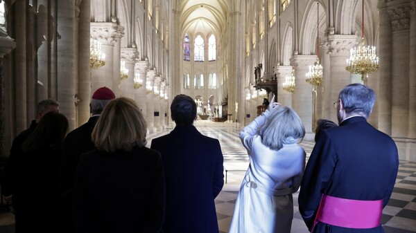 Ο Γάλλος πρόεδρος Εμανουέλ Μακρόν περιηγήθηκε στην Παναγία των Παρισίων, συνοδευόμενος από την Μπριζίτ Μακρόν και σημαντικούς παράγοντες που διαδραμάτισαν καθοριστικό ρόλο στην ανακατασκευή του ιστορικού καθεδρικού ναού.