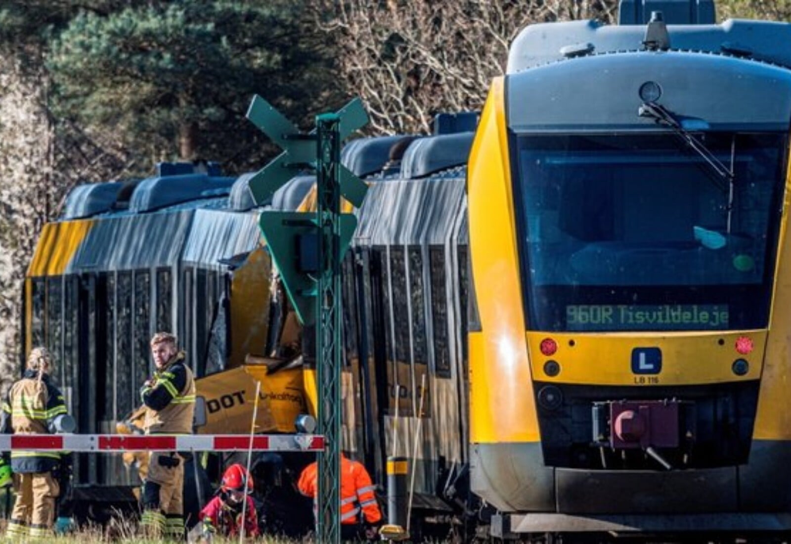 Το δημόσιο δίκτυο DR μετέδωσε πλάνα από δύο τρένα κίτρινου και γκρι χρώματος που αμφότερα φέρουν εμφανείς ζημιές στο μπροστινό τους τμήμα και είναι ακινητοποιημένα σε μια δασική περιοχή.