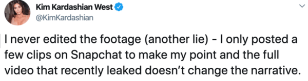 Η Κιμ Καρντάσιαν δεν έχει σχολιάσει ακόμη τις δηλώσεις της, αλλά το 2020 είχε αναφέρει ότι «κανείς δεν αρνήθηκε ποτέ ότι η λέξη "bitch" χρησιμοποιήθηκε χωρίς την άδειά της. Ποτέ δεν επεξεργάστηκα το υλικό, άλλο ένα ψέμα, δημοσίευσα μόνο μερικά αποσπάσματα στο Snapchat για να πω την άποψή μου».