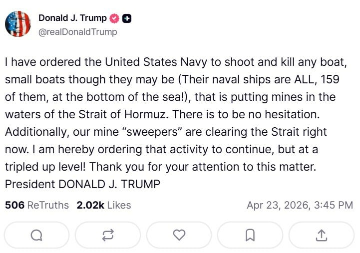 «Διέταξα το Πολεμικό Ναυτικό των Ηνωμένων Πολιτειών να πυροβολεί και να βυθίζει οποιοδήποτε σκάφος, όσο μικρό κι αν είναι (τα πολεμικά τους πλοία είναι ΟΛΑ, και τα 159, στον πάτο της θάλασσας!), που τοποθετεί νάρκες στα ύδατα των Στενών του Ορμούζ. Δεν θα υπάρξει καμία διστακτικότητα. Επιπλέον, τα ναρκαλιευτικά μας καθαρίζουν αυτή τη στιγμή τα Στενά. Διατάσσω η επιχείρηση αυτή να συνεχιστεί, αλλά με τριπλάσια ένταση. Σας ευχαριστώ για την προσοχή σας. Πρόεδρος DONALD J. TRUMP» σημείωσε ο Αμερικανός πρόεδρος.