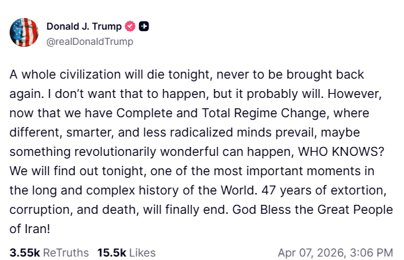 «Ένας ολόκληρος πολιτισμός θα χαθεί απόψε, χωρίς να ξαναγυρίσει ποτέ. Δεν θέλω να συμβεί αυτό, αλλά πιθανότατα θα συμβεί», γράφει ο Αμερικανός πρόεδρος σε ανάρτησή του στο Truth Social.