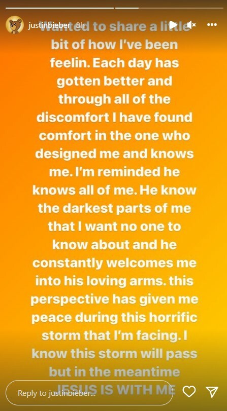 Ο Μπίμπερ δήλωσε ότι η γεμάτη πίστη οπτική του για την κατάσταση του προσφέρει γαλήνη κατά τη διάρκεια «αυτής της τρομερής καταιγίδας».