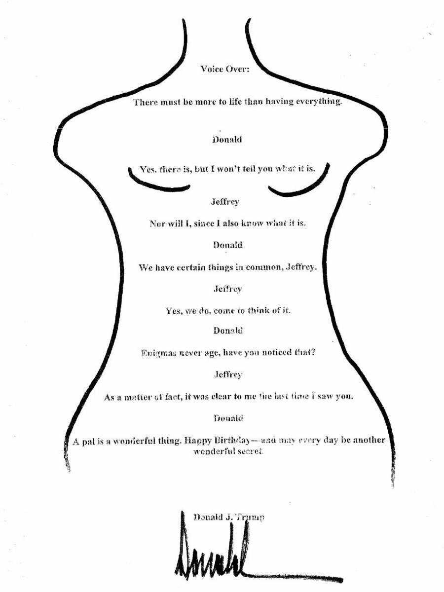 Το εύρημα έρχεται να ρίξει νέο φως στη μακρόχρονη σχέση μεταξύ του νυν Αμερικανού προέδρου και του καταδικασμένου για σεξουαλικά εγκλήματα χρηματιστή. Υπενθυμίζεται ότι το συλλεκτικό λεύκωμα γενεθλίων περιλαμβάνει μεταξύ άλλων και χειροποίητο σχέδιο γυναικείου σώματος με την υπογραφή «Donald». Η αισθησιακή κάρτα προς τον Έπσταϊν περιλαμβάνει μια συνομιλία μεταξύ του Τραμπ και του Έπσταϊν με τη σιλουέτα γυμνής γυναίκας να είναι ζωγραφισμένη γύρω της. Η υπογραφή του προέδρου βρίσκεται στο κάτω μέρος της κάρτας. Ο Λευκός Οίκος διέψευσε την αυθεντικότητα του σκίτσου γυμνού γυναικείου σώματος από τον Ντόναλντ Τραμπ προς τον Τζέφρι Έπσταϊν.