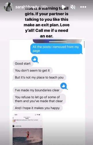 Η Σάρα Μπρέιντι στο Instastories της δημοσίευσε αρκετές εικόνες από μηνύματα που φέρεται να της έχει στείλει o Τζόνα Χιλ όταν είχαν σχέση, συμπεριλαμβανομένου ενός όπου φαίνεται να της λέει ότι αν κάνει σερφ με άλλους άντρες ή αν δημοσιεύσει φωτογραφίες της με μαγιό, τότε εκείνος δεν είναι ο κατάλληλος σύντροφος για εκείνη.