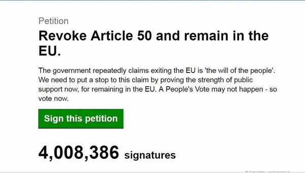 Ξεπέρασαν τα 4 εκατομμύρια οι υπογραφές της καμπάνιας που ζητάει να μη γίνει το Brexit και να παραμείνει το Ηνωμένο Βασίλειο στην Ευρωπαϊκή Ένωση.