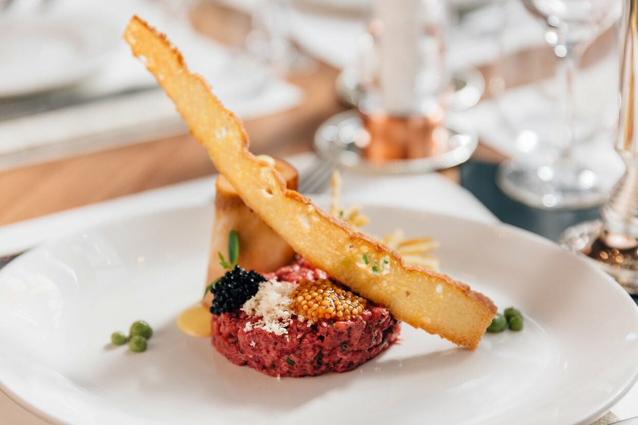 - Σε στρογγυλό τσέρκι σερβίρουμε στο πιάτο το ταρτάρ με τη ζεστή σάλτσα, δίπλα το κόκαλο με τη σάλτσα hollandaise και συνοδεύουμε με τηγανητές πατάτες κομμένες σε μέγεθος σπιρτόξυλου.