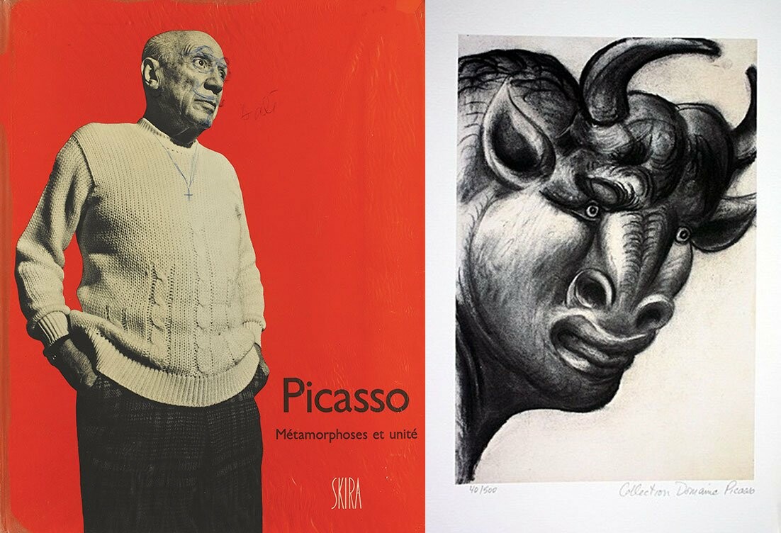 Αριστ., Picasso. Métamorphoses et Unité του Jean Leymarie. Geneva, Editions d'Art Albert Skira, 1971. Βλ. sothebys.com. Δεξ., σχέδιο του Picasso. Βλ. icollector.com.