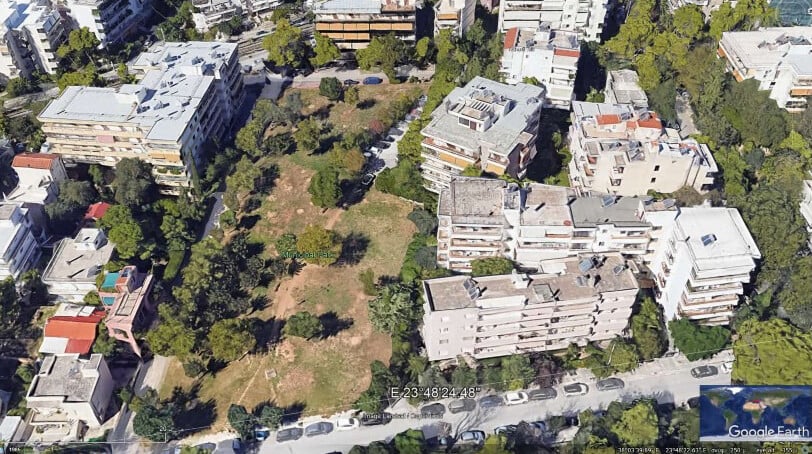 Το οικόπεδο, έκτασης 280 τ.μ., βρίσκεται σε ένα οικοδομικό τετράγωνο στη συμβολή των οδών Ηρώδου Αττικού, Δεμέστιχα και Κωνσταντινουπόλεως, που αποτελεί μια έκταση περίπου 4,5 στρεμμάτων. Το 1983, με τροποποίηση του ρυμοτομικού σχεδίου, δεσμεύτηκε για να γίνει χώρος πρασίνου. Κάτι τέτοιο όμως θα προϋπέθετε να αποζημιωθούν οι ιδιοκτήτες για την απαλλοτρίωση των ιδιοκτησιών τους. Αυτό δεν συνέβη και έτσι η έκταση επέστρεψε στους δικαιούχους και μέχρι στιγμής ο χώρος παραμένει αδόμητος.