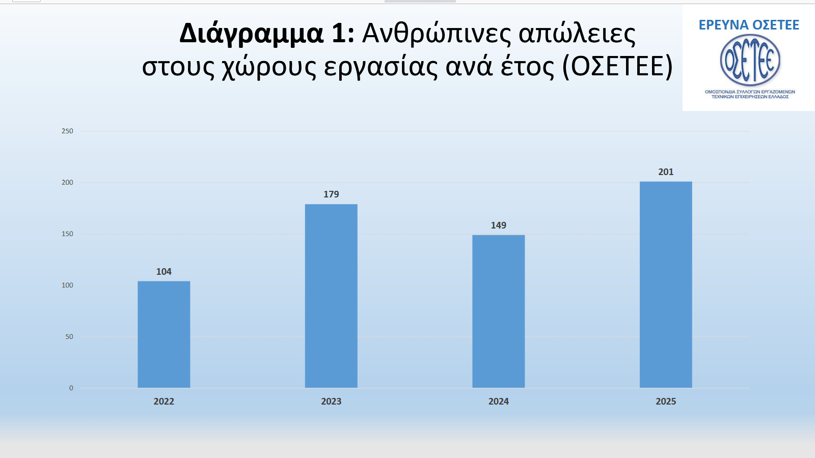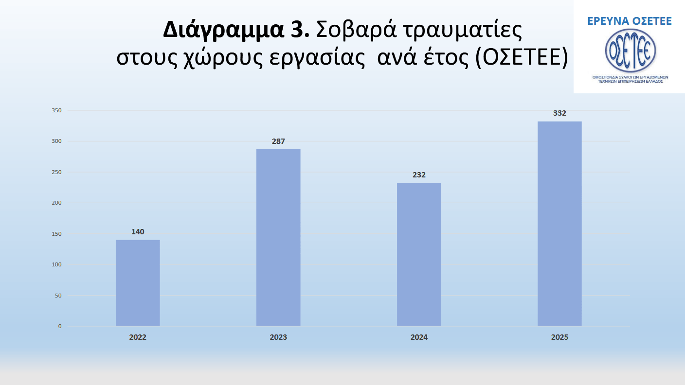 Τα στοιχεία που μας παραθέτει ο ΟΣΕΤΕ δεν είναι καθόλου ενθαρρυντικά, καθώς οι απώλειες εργαζομένων από το 2022 αυξάνονται δραματικά. Η έρευνα καταγράψει το θάνατο 104 ανθρώπων σε χώρους εργασίας, ενώ ο αριθμός των θανάτων σχεδόν διπλασιάζεται το 2025, στην διάρκεια του οποίου καταγράφονται 201 θανατηφόρα εργατικά ατυχήματα. Ιδιαίτερα ανησυχητική είναι και η αύξηση των σοβαρών τραυματισμών, καθώς ο αριθμός τους εκτοξεύεται μέσα σε διάστημα τριών ετών. Σύμφωνα με τα στοιχεία της έρευνας, ενώ το 2022 καταγράφονταν 140 σοβαρά τραυματίες, το 2025 ο αριθμός αυτός υπερδιπλασιάζεται, φθάνοντας τους 332, αποτυπώνοντας για τους συντάκτες της έκθεσης μία ραγδαία επιδείνωση των συνθηκών στους χώρους εργασίας