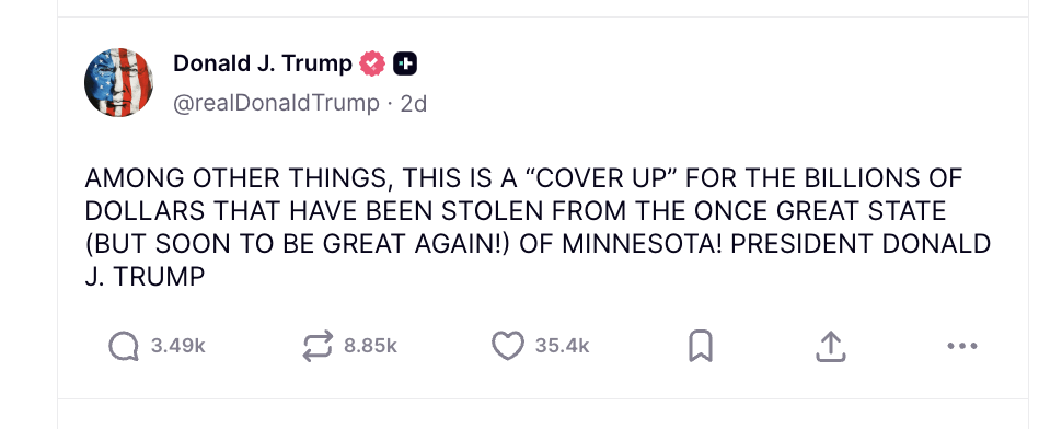 Το ίδιο έκανε και ο Τραμπ, υποστηρίζοντας μάλιστα ότι «πολλά από αυτά που βλέπετε είναι μία συγκάλυψη» για την υποτιθέμενη τεράστια οικονομική απάτη που, όπως είπε, έλαβε χώρα στη Μινεσότα. Με αυτή την απάτη συνέδεσε και την παρουσία 3.000 συνοριοφυλάκων στο εξαιρετικά επικίνδυνο σύνορο της Μινεσότα.. με τον Καναδά.