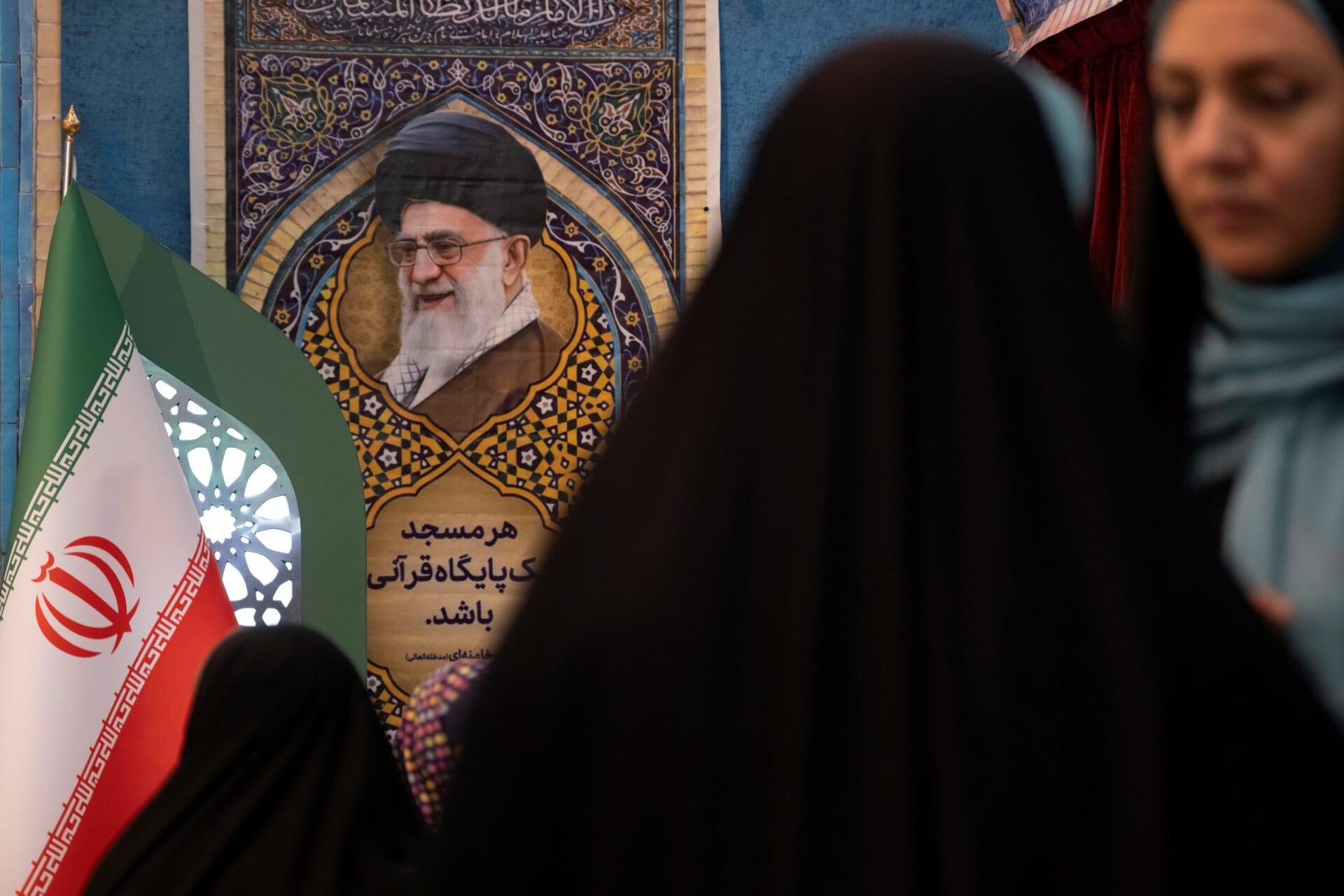 Πορτρέτο του ανώτατου ηγέτη του Ιράν, Αγιατολάχ Αλί Χαμενεΐ, στο Μεγάλο Τζαμί του Ιμάμη Χομεϊνί κατά τη διάρκεια της Διεθνούς Έκθεσης Κορανίου για τον εορτασμό του ιερού μήνα του Ραμαζανιού στο κέντρο της Τεχεράνης, Ιράν. Morteza Nikoubazl/NurPhoto μέσω Getty Images)