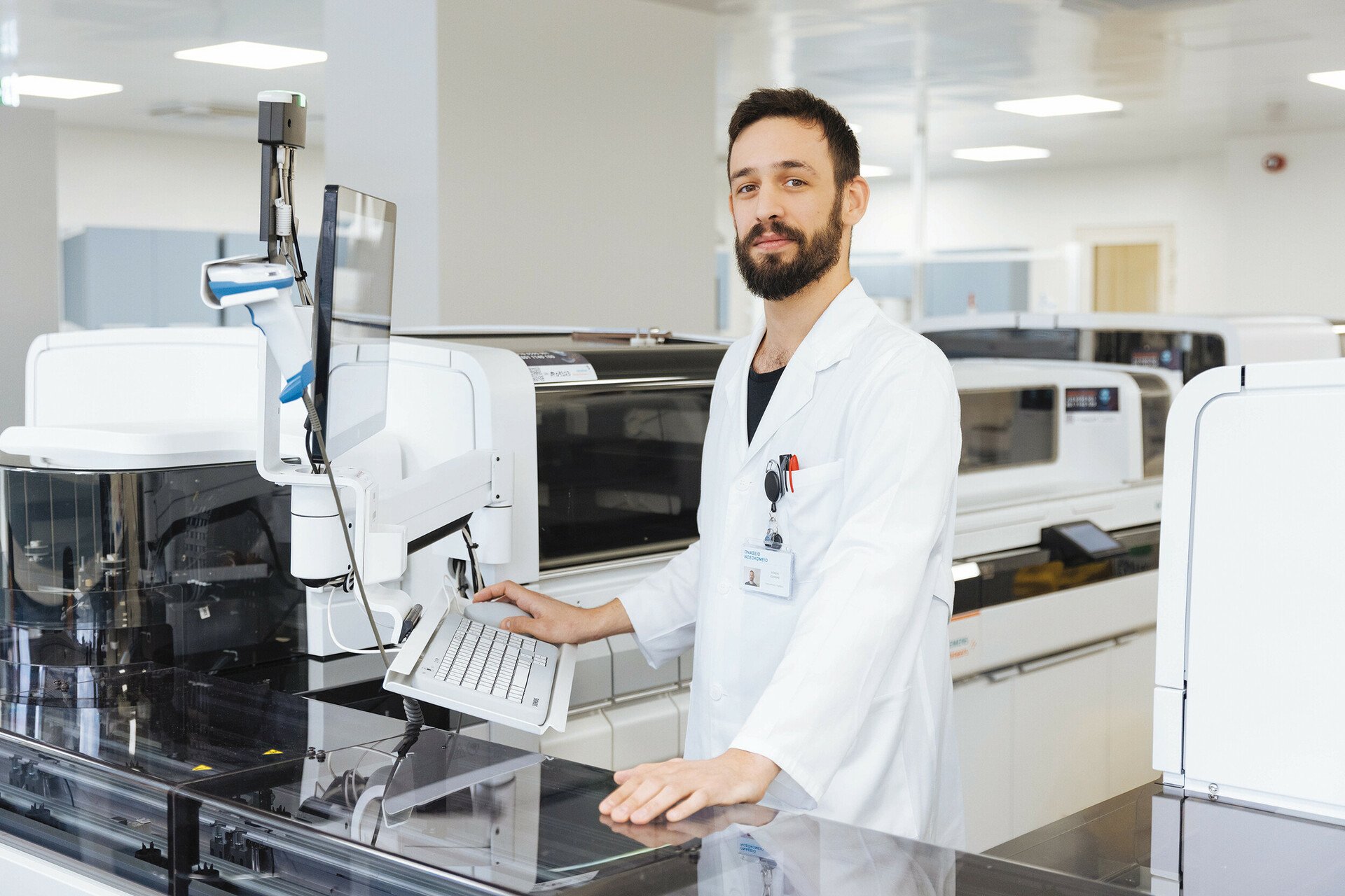 Μπαίνοντας βαθύτερα στο εργαστήριο, βλέπεις όλα εκείνα τα υλικά που συνθέτουν τις ζωτικές λειτουργίες ενός νοσοκομείου: σειρές από σωληνάρια διαφορετικών χρωμάτων, ορούς, μικροσκόπια, κασέτες δειγμάτων, αντιδραστήρια ψύξης και πάγκοι όπου φτάνουν τα δείγματα προς ανάλυση, την αλυσίδα διαλογής, μια γραμμή όπου κάθε δείγμα σαρώνεται, κωδικοποιείται και ταξινομείται. Οι φυγόκεντροι δουλεύουν αδιάκοπα, ενώ δίπλα οι αιματολογικοί και βιοχημικοί αναλυτές παρέχουν πληροφορίες που μέχρι πριν από λίγα χρόνια απαιτούσαν πολλαπλά στάδια χειροκίνητης παρέμβασης. Τα δείγματα που χρειάζονται συντήρηση περνούν στα ειδικά ψυγεία και στο σημείο αυτό ακούω τον κ. Ντάση, που ήδη βρίσκεται δύο χρόνια σε αυτή τη θέση, να μου λέει: «Βάζεις το δείγμα εδώ», δείχνοντάς μου μια ειδική υποδοχή στο μηχάνημα, «και από εκεί και πέρα όλα γίνονται αυτοματοποιημένα: η διαλογή, οι μετρήσεις, η αποστολή των αποτελεσμάτων, μέχρι και η αποθήκευση των δεδομένων στον ιατρικό φάκελο».