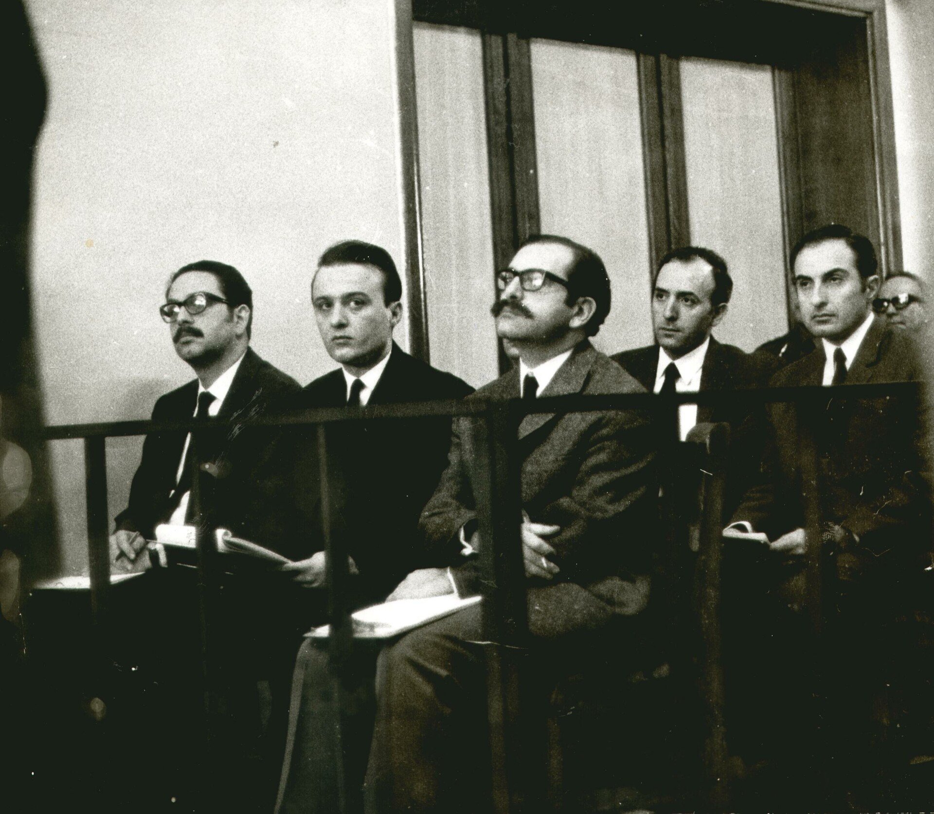 Οι κατηγορούμενοι στη δίκη της “Δημοκρατικής Άμυνας”. Από αριστερά : Παύλος Ζάννας, Γιώργηος Σιπητάνος, Στέλιος Νέστωρ, Σωτήρης Δέδες και Αργύρης Μαλτσίδης. Ο έκτος κατηγορούμενος Κώστας Πύρζας “κρύβεται” πίσω από τον Νέστορα.