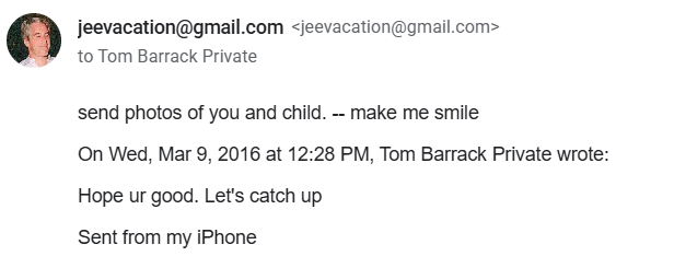 Με την πρόσφατη νέα αποσφράγιση εγγράφων της υπόθεσης Έπστιν έγινε γνωστό ότι ο Μπαράκ διατηρούσε, όχι απλώς μία γνωριμία, αλλά μία πολύ στενή επαφή μαζί του για πολλά χρόνια, όπως φανερώνει το εύρος των θεμάτων που συζητούσαν οι δυο τους, μέσω ηλεκτρονικής αλληλογραφίας, καθώς και η μεγάλη οικειότητα που φαίνεται να είχαν. Υπάρχει επίσης ένα μέιλ που έστειλε ο καταδικασμένος παιδόφιλος και διακινητής Τζέφρι Έπστιν στον Τομ Μπαράκ, στις 9 Μαρτίου 2016, το οποίο ανακάλυψαν το προηγούμενο διάστημα αμερικανοί δημοσιογράφοι, όπου του έλεγε: «κάνε με να χαμογελάσω με φωτογραφίες του παιδιού».