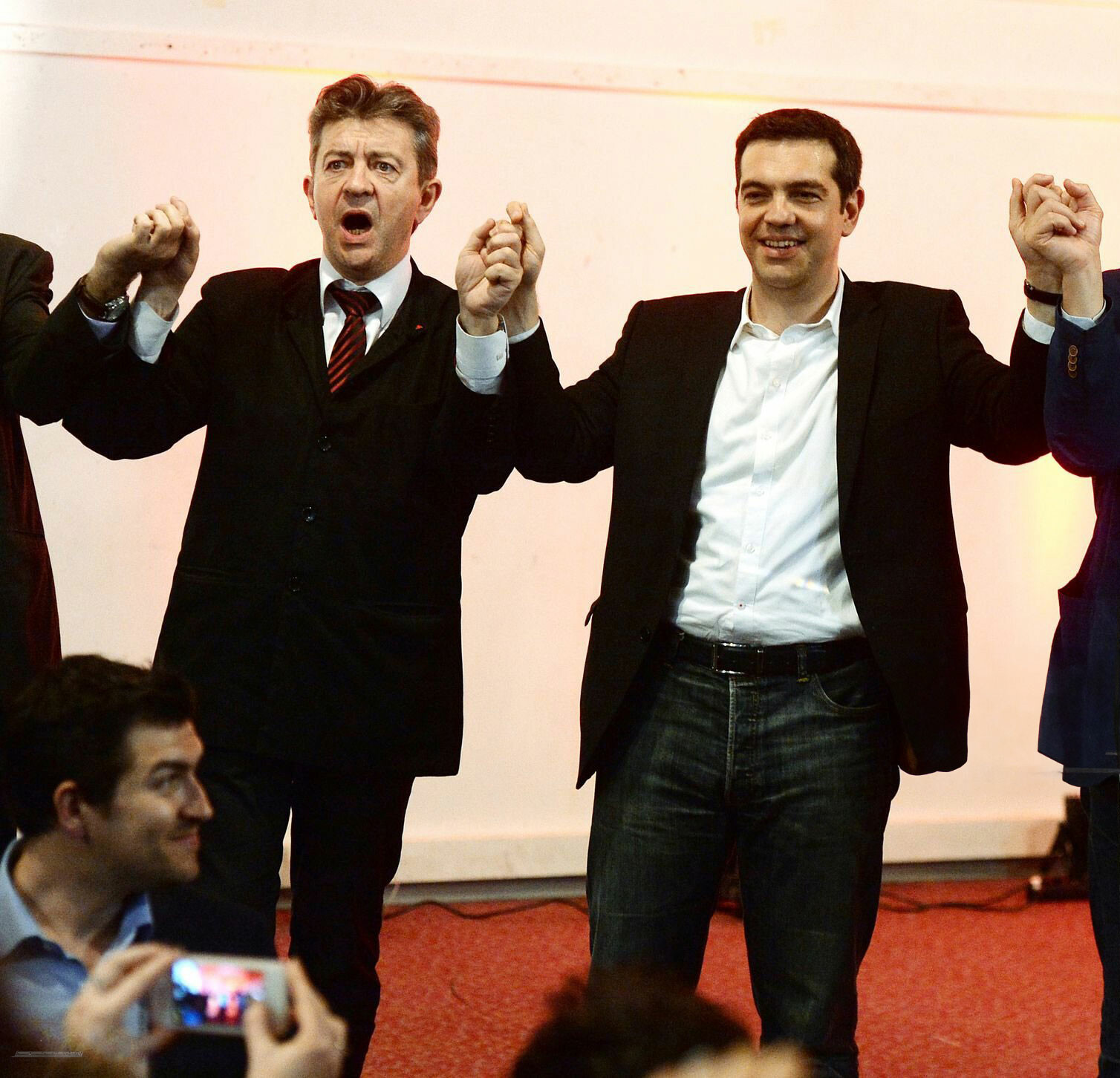 Ο Μελανσον και ο Τσιπρας το 2014 στο Παρίσι κατά τη διάρκεια προεκλογικής συνάντησης του Front de Gauche (PG και PC, γαλλικό κομμουνιστικό κόμμα) έξι εβδομάδες πριν από τις ευρωπαϊκές εκλογές. Ο Τσίπρας ήταν τότε ένας από τους βασικούς υποψήφιους για την προεδρία του Ευρωπαϊκού Κοινοβουλίου. Φωτ.: Getty Images/Ideal Image