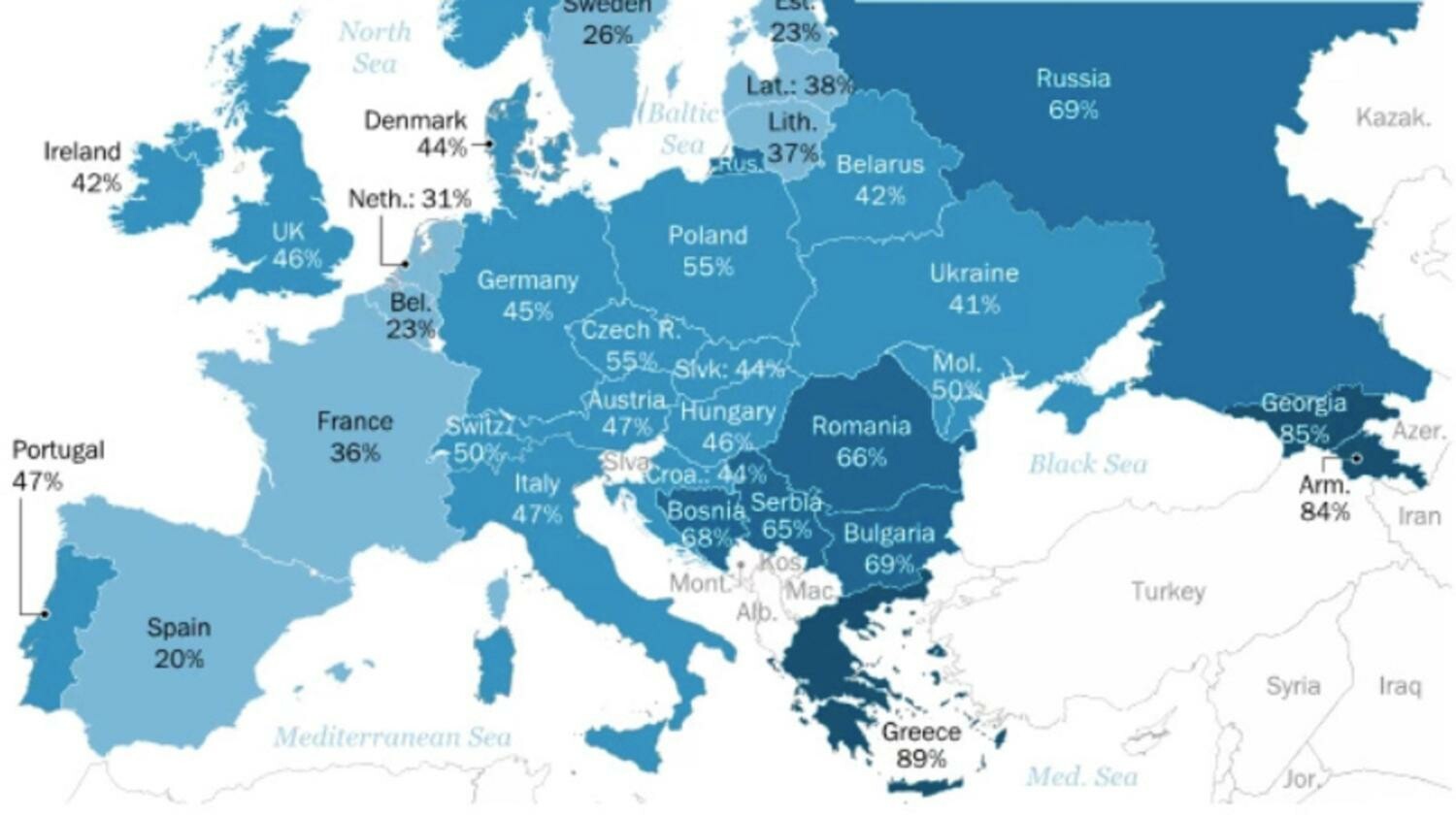 Με 89%, η Ελλάδα είναι η πρώτη των πρώτων 8 χωρών: Γεωργία (δεύτερη με 85%), Αρμενία, Ρωσία, Βουλγαρία, Βοσνία, Ρουμανία, Σερβία (όγδοη με 65%).